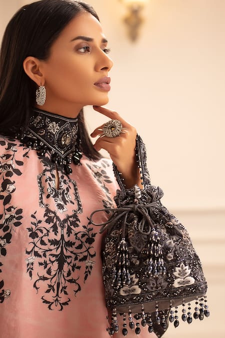 Black potli bag featuring intricate floral motifs and embroidered wristlet