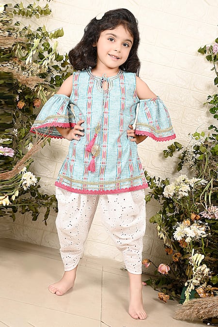Blue Handloom Cotton Tassels, Stripe Pattern Cold Shoulder Kurta With Dhoti Pant