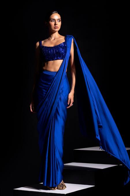 Electric blue Armani satin pre-draped saree with a plain pattern. Paired with a matching blouse featuring all-over metallic unique tikki embroidery in shades of blue with hints of silver Swarovski.