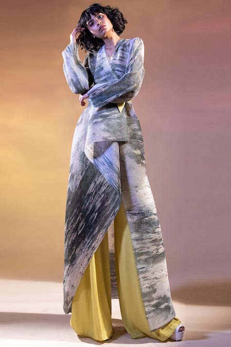 White Georgette, Satin, Moss Crepe Open Asymmetric Printed Jacket