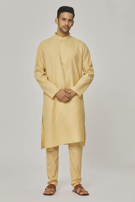 Dawn yellow cotton kurta featuring a band collar and full sleeves. Paired with matching pyjama, it has an asymmetric hemline and front button closure.