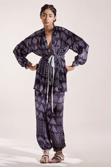 Crepe bandhej blue tunic with adjustable belt. Comes with draped pant.
