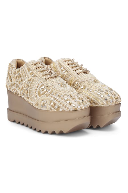 Off white wedge sneakers featuring intricate hand embroidery with beads, mirrors, cutdana, dabka, and sequins