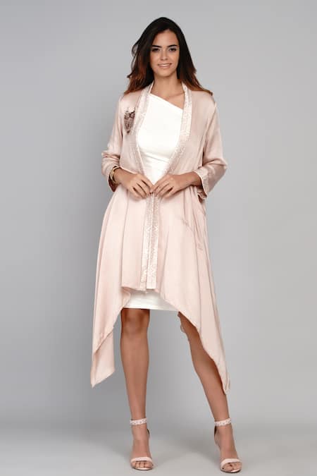 Pink asymmetric cape with geometric motif border & placement owl embroidered motif.