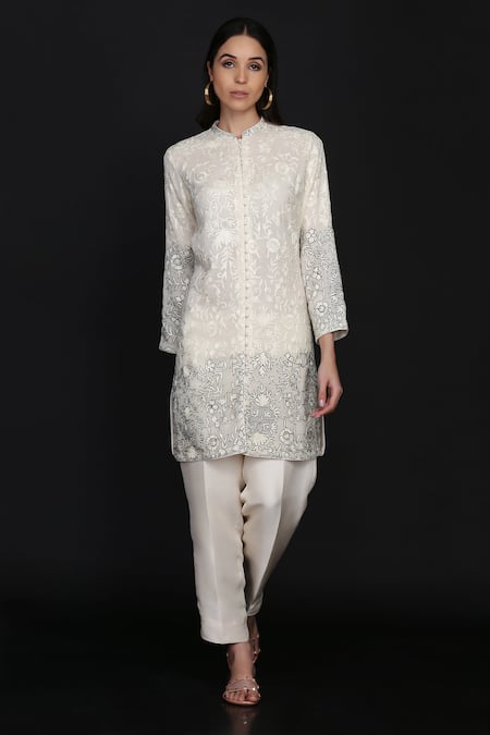 Ivory jacket featuring floral vine motifs in gara, resham and sequinwork embroidery. Paired with a matching flared pant for a cohesive look.