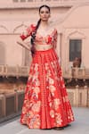 Red lehenga featuring floral digital printed motifs and sequins embroidery. Paired with a zari embroidered blouse with a sweetheart neckline and half sleeves.