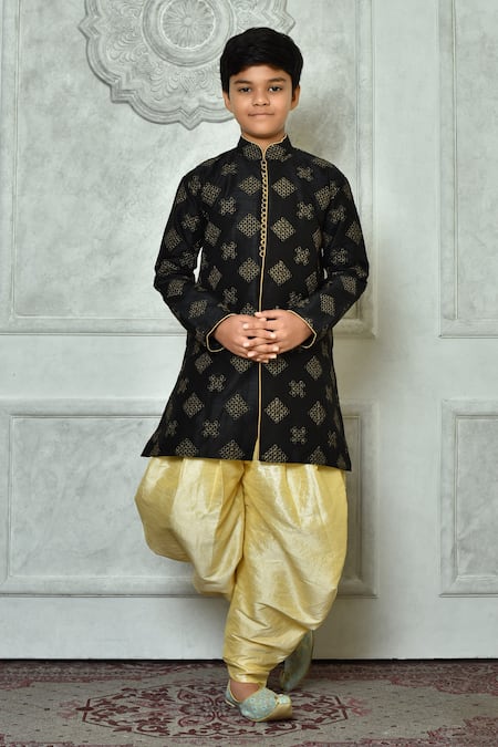 Black kurta featuring floral thread work and a mandarin collar. Paired with beige patiala pant for a complete look.