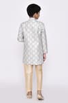 Sky blue and grey sherwani featuring geometric and swirl pattern thread embroidery. Paired with a solid silk dupion pyjama with an elasticated waistband.