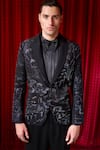 Black tuxedo with Swarovski embroidery. Paired with a bell bottom trouser.