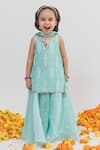Blue kurta featuring mirror and thread embroidery with a keyhole front cut-out. Paired with a matching sharara and dupatta.