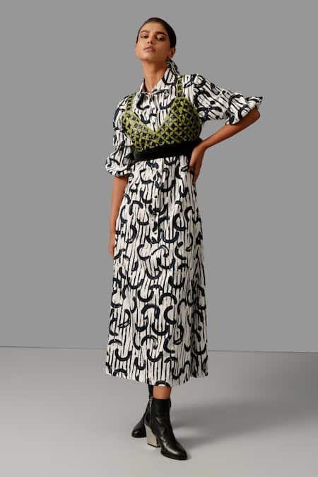 Black Leather, Cotton Cut Work V-neck, Printed Shirt Dress And Bralette Set