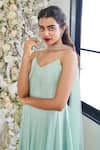 Blue sleeveless anarkali featuring gardenia embroidery with cutdana, sequins, and beads. Paired with a flared sharara and a dupatta.