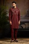 Maroon kurta featuring full sleeves, mandarin collar, and intricate zari thread and mirror embroidery. Paired with matching pants for a coordinated look.