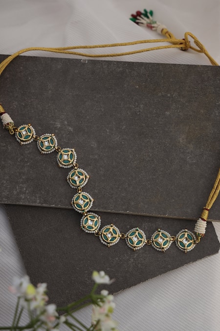 Noteworthy Feature: Green meenakari with intricate detailing, Shell pearls accentuating the design, Adjustable dori for versatile wear
