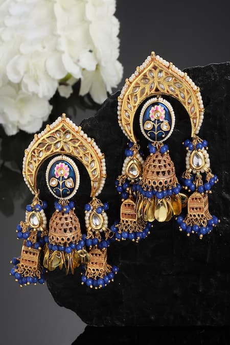 Blue jhumkas featuring intricate kundan work, embellished with pearls and natural stones