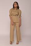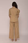 Beige Cotton Satin Kantha Collared Tuck Puff Sleeve Top And Pant Set