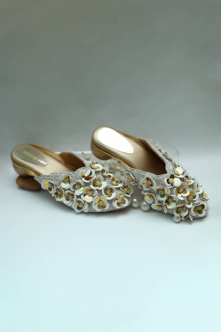 Gold and white mule heels featuring bead and sequin embroidered 3D floral patterns