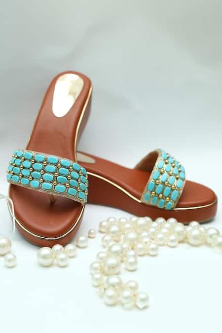 Blue and brown stone embellished strap wedges featuring zardozi embroidery