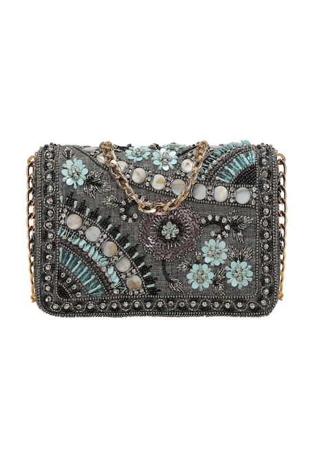 Noteworthy Feature: Gold chain for easy carrying, Flap over closure, Sequin and bead embellishments