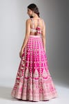 Rani pink lehenga featuring all-over mirror and thread bloom embroidery. Paired with a padded blouse and organza dupatta.