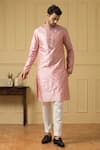 Pink dupion silk kurta featuring tonal thread and diamond cut mirror hand embroidery on the mandarin collar, placket, and sleeve borders
