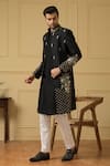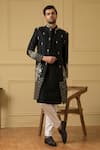 Black jacket featuring floral embroidery with cutdana and sequin embellishments. Paired with a plain kurta and pant, both in semi raw silk fabric.