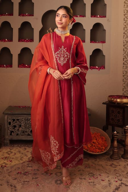 A maroon straight kurta crafted from Chanderi fabric with Shantoon lining, featuring intricate embroidery. It is paired with coordinating maroon pants and an orange Organza dupatta.
