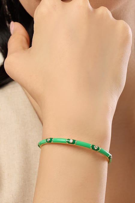 No of Component: 1Components: CuffNoteworthy Feature: Enamel detailing with CZ stones, 18kt gold plating for durabilityOccasions: Versatile for casual and festive eventsStyle Genre: Contemporary style braceletPattern: SolidType of Work: CrystalsColor: GreenComposition: BrassSize Details: Length: 5.5 cm, Width: 4.9 cmWeight Details: Weight: 9.79gVisible Items not included: Only single piece bracelet is being sold.Care Instruction: Avoid contact with water & perfumeStyle: Modern minimalist cuffLength: Standard lengthExact Length: 5.5 cm length, 4.9 cm widthExact Weight: 9.79 gramsChain Style: Cable Chain styleFinish Style: Glossy finishGemstone: Cubic Zirconia (CZ)Weight: Lightweight cuffWidth: Standard widthGemstone Color: Clear colorGemstone Cut: Round-cut CZ stonesGemstone Shape: Round stonesGemstone Transparency: Transparent stonesPlating: 18kt gold platingSetting Style: Prong setting