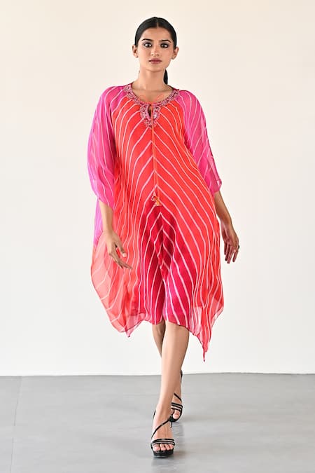 Multi color georgette dress featuring a keyhole round neck and batwing sleeves. Paired with a sweetheart neck inner slip and embellished with beads, sequins, and thread work.