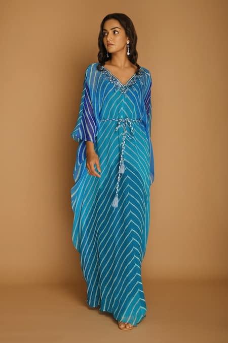 Blue Georgette V Neck Printed Kaftan