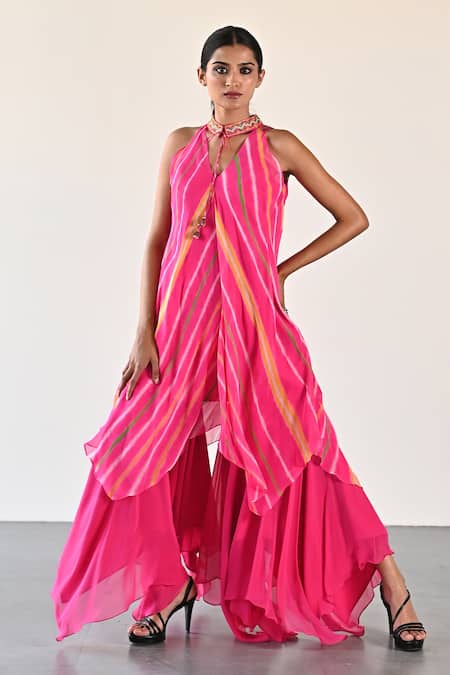 Pink georgette top featuring an all-over stripe pattern with bead, sequin, and thread embellishments. Paired with flared handkerchief pants and an inner slip.