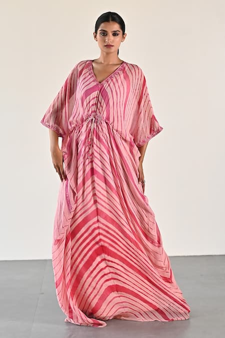 Peach georgette tunic featuring a wave pattern and embellished with beads, sequins, and thread work. Paired with a sweetheart neck inner slip and designed with batwing sleeves and a front gathered tasselled tie-up.