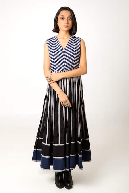 Black maxi dress featuring V neck and sleeveless design with chevron applique embroidery
