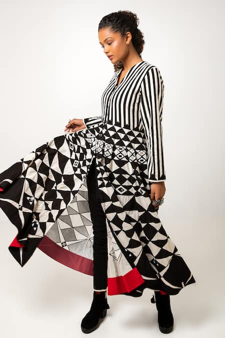 Black and white reversible A-line dress featuring stripe work with applique and mirror embroidery