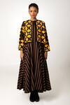 Black and mustard yellow cropped jacket featuring mirror embroidery and a round neckline
