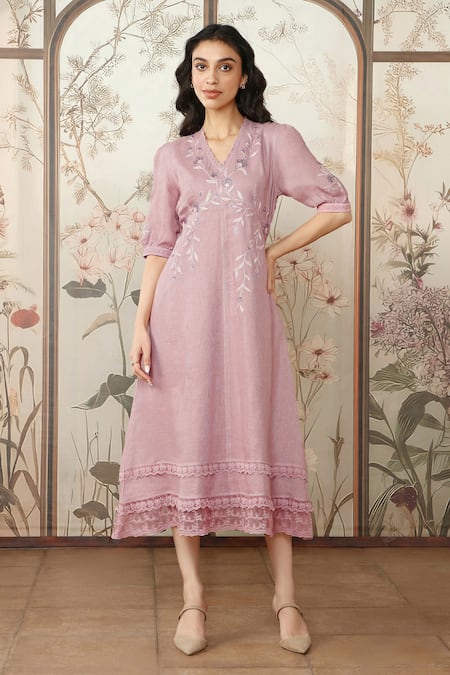Pink 100% Linen Embroidered Viners V Neck Dahlia Dia Midi Dress
