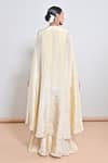 Ivory asymmetric tunic featuring bead, sequin & cutwork hand embroidery in flower motif and long draped sleeves. Paired with a hand embroidered palazzo.