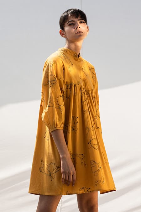 Yellow A-line dress with floral screen print & pleated empire bodice.
