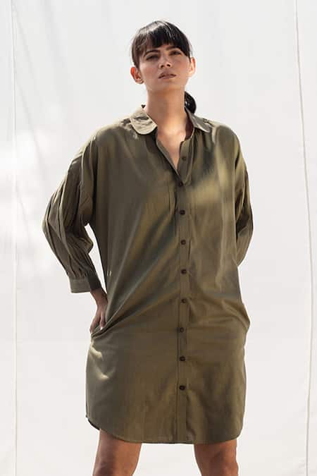 Olive green shirt dress with drop shoulders & balloon sleeves.