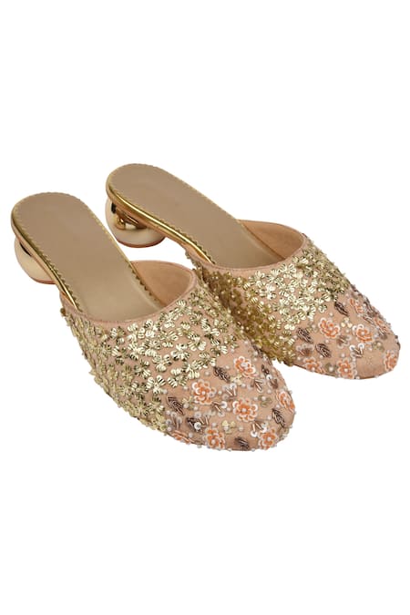 Rose gold kitten heel mules adorned with gold flower sequin and pearl embroidery. Featuring a circular heel with a height of 1.5 inches.