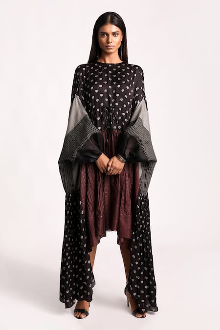Black and maroon printed asymmetric dress with lotus & checkered print details and puff sleeves.