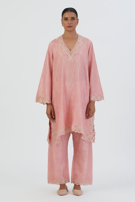 Pink Silk Embroidery Petunia Lace V Naaz Border Kurta With Palazzo