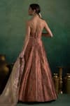 Gold and maroon lehenga featuring floral woven patterns with a cancan. Paired with a padded off-shoulder blouse and an organza dupatta.