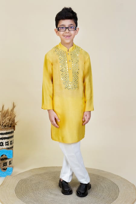 Yellow kurta featuring mirror work embroidery around the lapel. Paired with an off-white cotton silk pyjama.