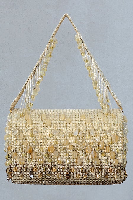 Gold flap clutch featuring hand embroidered semi-precious gems, Japanese micro beads & crystals in an ombre pattern. Includes a detachable handle adorned with lustrous micro beads, crystals, and diamante.