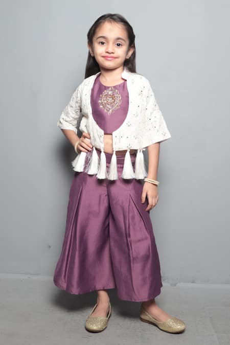 White embroidered jacket featuring mirror work motifs and tassel details. Paired with a purple embroidered top and palazzo pants.