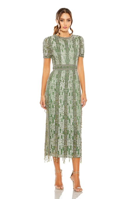 Green midi dress featuring puffed sleeves and all-over sequin floral art embroidery