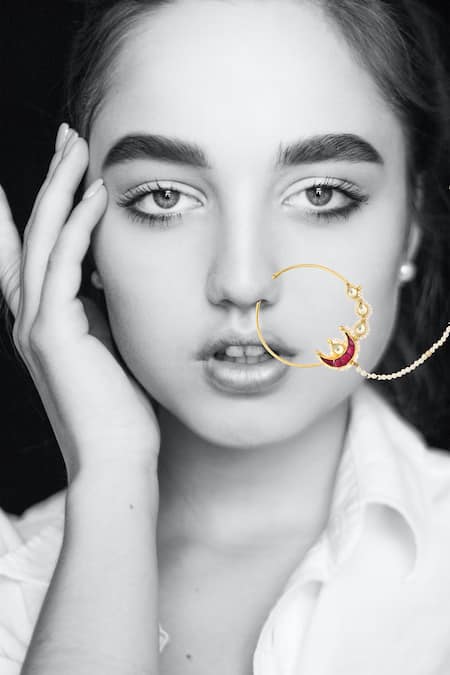 Gold nath featuring a crescent moon motif, encrusted with kundan and a string of pearls