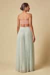 Mint green gharara featuring intricate sequin and bead embroidery. Paired with a padded peach draped blouse and an open cape.