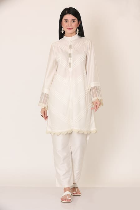 White embroidered tunic featuring a band collar, long scalloped sleeves, and pearl and sequin work. Paired with straight pants in a matching fabric.